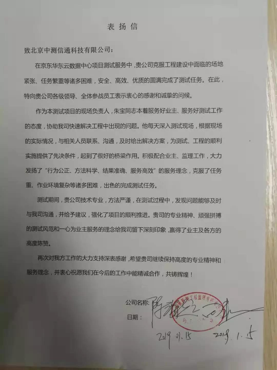 此次測(cè)試工作圓滿(mǎn)完成,業(yè)主方贊不絕口,并提出書(shū)面表?yè)P(yáng)!