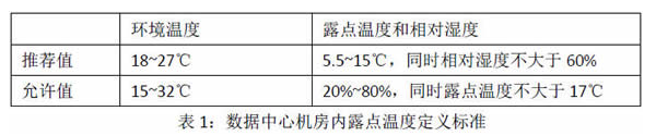 露點溫度是數(shù)據(jù)中心內(nèi)部用于監(jiān)控機房環(huán)境的重要參數(shù)。在數(shù)據(jù)中心里,肯定不能讓房間的溫度達到露點溫度,F(xiàn)在的數(shù)據(jù)中心建設(shè)規(guī)模都比較大,機房內(nèi)設(shè)備密度也大。數(shù)據(jù)中心內(nèi)部的溫差巨大,但露點溫度在整個房間的范圍內(nèi)基本上是一致的,所以這是一個更靠譜的濕度調(diào)節(jié)指標。因為大量的熱源冷卻設(shè)備沒有提供濕度控制,又必須讓控制的濕度保持在露點以上來避免結(jié)露,露點控制是唯一手段。根據(jù)電子信息設(shè)備技術(shù)的發(fā)展、國外相關(guān)標準的變化以及節(jié)能要求,對數(shù)據(jù)中心內(nèi)部的露點溫度等參數(shù)做了詳細規(guī)定。機房內(nèi)的溫度、露點溫度和相對濕度應滿足電子信息設(shè)備的使用要求,具體如表1所示: