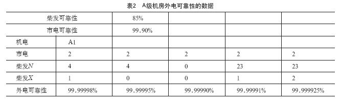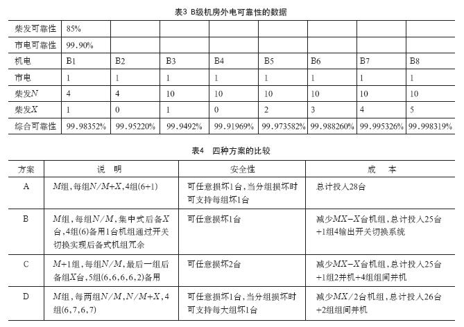 從字面上,不管N是6臺還是12臺還是18臺,后備1臺都可以視為滿足規(guī)范要求;但是有朋友按照空調(diào)末端冗余N+X,N>4常規(guī)備用2臺的實踐經(jīng)驗,覺得實際末端可靠性在90%,而實際柴發(fā)可靠性也約在80%~90%之間,覺得4臺以上也應(yīng)該備用2臺。表2和表3分別給出了柴發(fā)可靠性經(jīng)驗值為85%,市電可靠性經(jīng)驗值為99.90%時,A級機房和B級機房外電可靠性的數(shù)據(jù)。