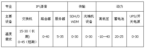 上表中所列舉溫度是該設(shè)備正常工作所需要的環(huán)境溫度條件;從表中可以得知,除蓄電池需要嚴(yán)格的溫度范圍(20-25℃)外,其他設(shè)備工作溫度可以在15-30℃之間;
