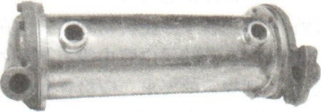 水冷式潤滑油冷卻裝置的實物外形及零件分解如圖6-36和圖6-37所示。它主要由芯子和殼體組成。芯子由黃銅管、散熱片和隔片組成。潤滑油在芯子與殼體的夾層之間流動。冷卻液在芯子內(nèi)部流動時,帶走潤滑油的部分熱量。經(jīng)過冷卻液的循環(huán)往復(fù)流動,使油溫控制在80·C±5·C范圍內(nèi)。