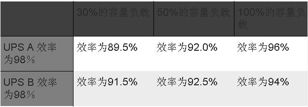 當在對比選擇決定兩款UPS中的哪款更更有效時,滿負載容量情況下,效率為96%的UPS A將是合乎邏輯的選擇;但當在不同的操作容量能力情況下進行對比時(如下表2),結果便出現了大反轉。在容量能力低于50%的情況下,“效率較低”的UPS的實際效率要比效率為96%的UPS更高效。