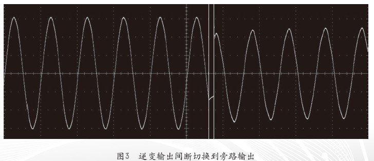 圖1為在線式UPS從旁路輸出切換到逆變輸出的波形圖。可以從圖中看到,由于旁路市電的電壓比逆變器設(shè)定的電壓稍高,所以在切換前逆變器升高了輸出電壓,使輸出電壓與旁路電壓相同或者略高于旁路電壓,這樣可以防止市電向逆變器反灌電流而對(duì)逆變器產(chǎn)生損壞。此時(shí)旁路輸出和逆變輸出均已開(kāi)啟,并同時(shí)向負(fù)載供電。一段時(shí)間后,旁路輸出關(guān)閉,逆變器調(diào)整輸出電壓下降至UPS的設(shè)定值,逆變器正常輸出,UPS完成旁路輸出到逆變輸出的切換。