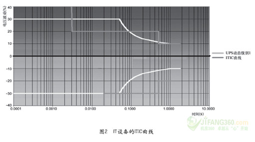 由此可以得出如下結(jié)論:IT負(fù)載完全允許在一定范圍內(nèi)波動(dòng)的輸入交流電源。這一結(jié)論也與 IEEE給出的計(jì)算機(jī)對(duì)電能質(zhì)量要求的ITIC電壓容限曲線完全相符,如圖2所示。
