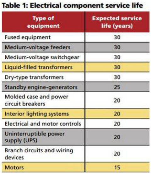 如維護(hù)保養(yǎng)得當(dāng),建筑中商業(yè)級(jí)配電系統(tǒng)的使用年限通常在20至30年,配電組件使用年限如下表: