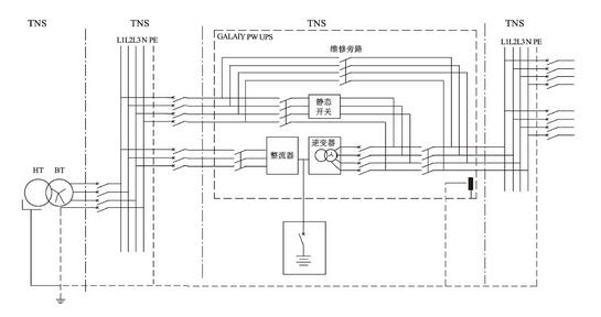 從圖1中可以看出,在UPS上下線都是TN-S接地方式時(shí),由晶閘管整流器組成的UPS或稱(chēng)之為工頻機(jī)(無(wú)論這個(gè)稱(chēng)呼是否準(zhǔn)確),其中性線N是由UPS的旁路輸入端引入的,并且與逆變變壓器(而不是起“隔離”作用的變壓器)的中性點(diǎn)直接連接,作為UPS輸出的中性線。這種連接方式的目的是:由于UPS的靜態(tài)旁路時(shí)時(shí)刻刻處于“待切換”的鎖相同步狀態(tài),當(dāng)負(fù)載需要從逆變器供電切換到由靜態(tài)旁路供電(或相反切換)時(shí),為了避免兩路交流電源切換時(shí)由于基準(zhǔn)電位不一致而產(chǎn)生較大的環(huán)流,導(dǎo)致切換失敗,因此這兩路電源的基準(zhǔn)電位必須是一致的,在電路上是采用同一條中性線的連接作為基準(zhǔn)電位來(lái)保證。