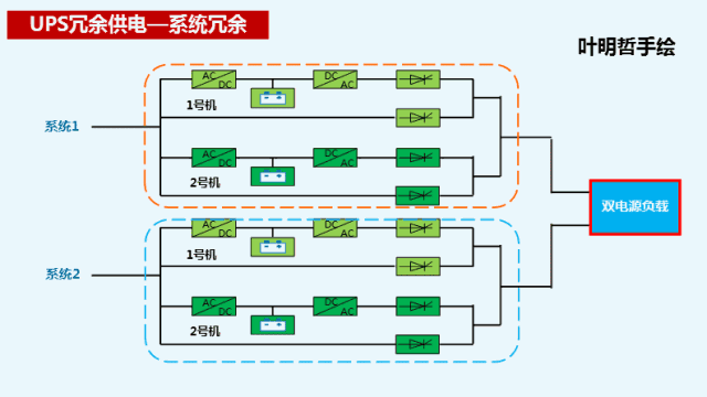 常見的是雙總線系統(tǒng),系統(tǒng)內(nèi)部設(shè)備獨立,配電系統(tǒng)獨立,是目前業(yè)內(nèi)公認(rèn)的最可靠及可行的工作方式,冗余方式發(fā)揮作用前提是負(fù)載設(shè)備配備雙電源模塊,且兩個電源模塊式負(fù)載分擔(dān)模式工作,該方法也被普遍采用。
