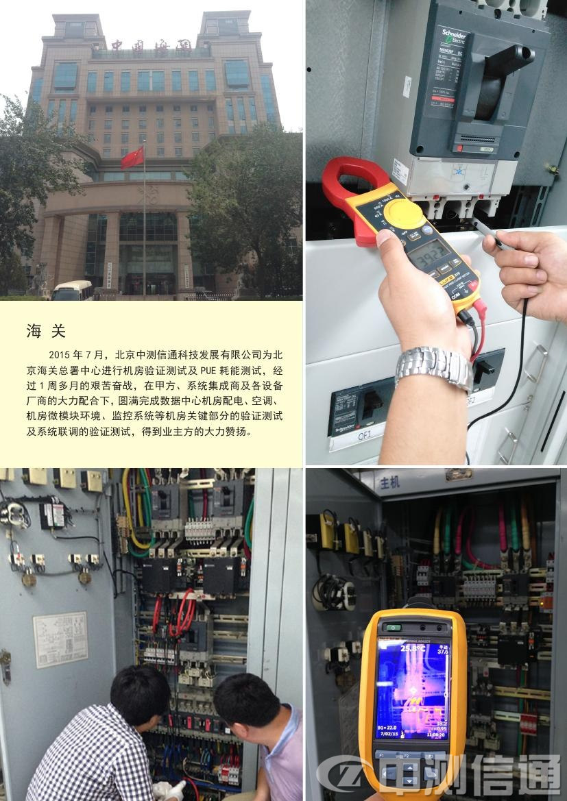 2015年7月,北京中測(cè)信通科技發(fā)展有限公司為北京海關(guān)總署中心進(jìn)行機(jī)房驗(yàn)證測(cè)試及PUE耗能測(cè)試,經(jīng)過(guò)1個(gè)多月的艱苦奮戰(zhàn),在甲方、系統(tǒng)集成商及各設(shè)備廠(chǎng)商的大力配合下,圓滿(mǎn)完成數(shù)據(jù)中心機(jī)房配電、空調(diào)、機(jī)房微模塊環(huán)境、監(jiān)控系統(tǒng)等機(jī)房關(guān)鍵部分的驗(yàn)證測(cè)試及系統(tǒng)聯(lián)調(diào)的驗(yàn)證測(cè)試,得到業(yè)主方的大力贊揚(yáng)。