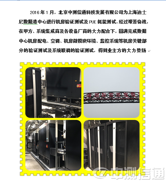 2015年8月,北京中測(cè)信通科技發(fā)展有限公司為上海迪斯尼數(shù)據(jù)中心進(jìn)行機(jī)房驗(yàn)證測(cè)試及PUE耗能測(cè)試,經(jīng)過(guò)艱苦奮戰(zhàn),在甲方、系統(tǒng)集成商及各設(shè)備廠商的大力配合下,圓滿完成數(shù)據(jù)中心機(jī)房配電、空調(diào)、機(jī)房微模塊環(huán)境、監(jiān)控系統(tǒng)等機(jī)房關(guān)鍵部分的驗(yàn)證測(cè)試及系統(tǒng)聯(lián)調(diào)的驗(yàn)證測(cè)試,得到業(yè)主方的大力贊揚(yáng).