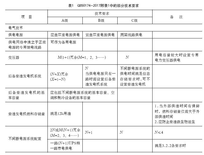 在GB50174-2017《數(shù)據(jù)中心設(shè)計規(guī)范》的附錄1《各級數(shù)據(jù)中心技術(shù)要求》的“電氣技術(shù)”中,對數(shù)據(jù)中心備用電源系統(tǒng)作出了具體的技術(shù)要求,見表1。