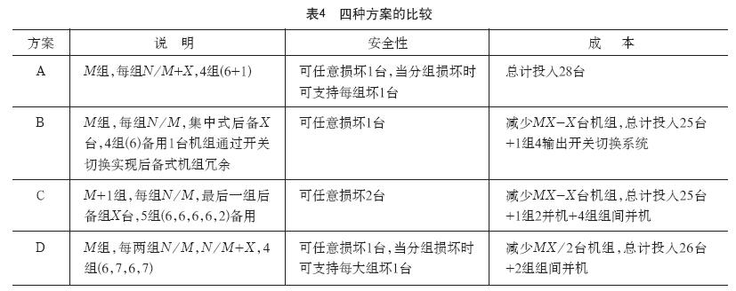 在表4中,A屬于常見型,D屬于有案例,B、C均只屬于理論可行,其中B屬于硬件后備式冗余,C屬于軟件后備式冗余。C的備用組也可以僅設(shè)置1臺機組。當(dāng)項目規(guī)模較大,比如3萬機柜,18組每組6臺,可考慮設(shè)置一組備用6臺,直接進行負載切換,而不需要組間并機,可以視為C的一種變型。