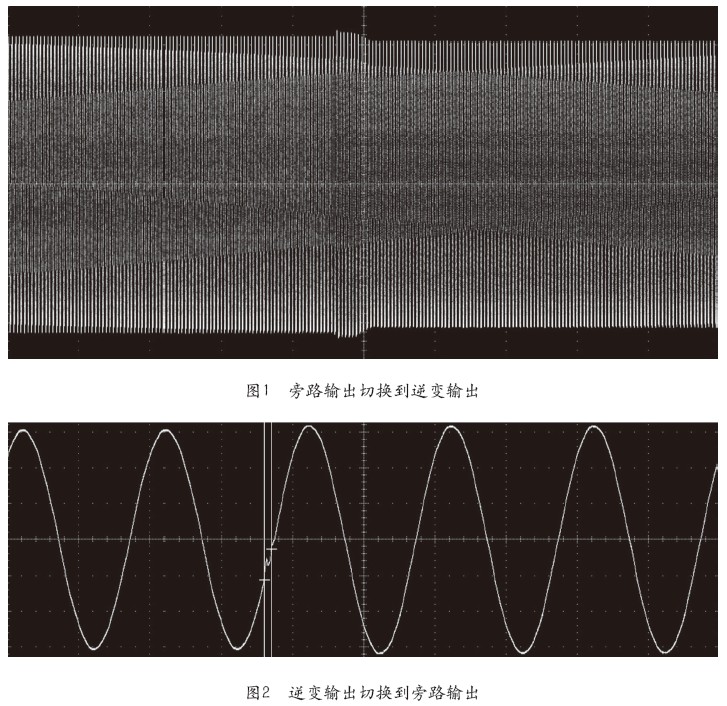 圖1為在線式UPS從旁路輸出切換到逆變輸出的波形圖。可以從圖中看到,由于旁路市電的電壓比逆變器設(shè)定的電壓稍高,所以在切換前逆變器升高了輸出電壓,使輸出電壓與旁路電壓相同或者略高于旁路電壓,這樣可以防止市電向逆變器反灌電流而對(duì)逆變器產(chǎn)生損壞。此時(shí)旁路輸出和逆變輸出均已開(kāi)啟,并同時(shí)向負(fù)載供電。一段時(shí)間后,旁路輸出關(guān)閉,逆變器調(diào)整輸出電壓下降至UPS的設(shè)定值,逆變器正常輸出,UPS完成旁路輸出到逆變輸出的切換。