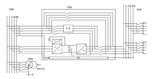 從圖1中可以看出,在UPS上下線都是TN-S接地方式時(shí),由晶閘管整流器組成的UPS或稱(chēng)之為工頻機(jī)(無(wú)論這個(gè)稱(chēng)呼是否準(zhǔn)確),其中性線N是由UPS的旁路輸入端引入的,并且與逆變變壓器(而不是起“隔離”作用的變壓器)的中性點(diǎn)直接連接,作為UPS輸出的中性線。這種連接方式的目的是:由于UPS的靜態(tài)旁路時(shí)時(shí)刻刻處于“待切換”的鎖相同步狀態(tài),當(dāng)負(fù)載需要從逆變器供電切換到由靜態(tài)旁路供電(或相反切換)時(shí),為了避免兩路交流電源切換時(shí)由于基準(zhǔn)電位不一致而產(chǎn)生較大的環(huán)流,導(dǎo)致切換失敗,因此這兩路電源的基準(zhǔn)電位必須是一致的,在電路上是采用同一條中性線的連接作為基準(zhǔn)電位來(lái)保證。