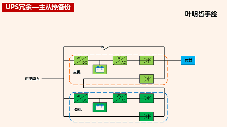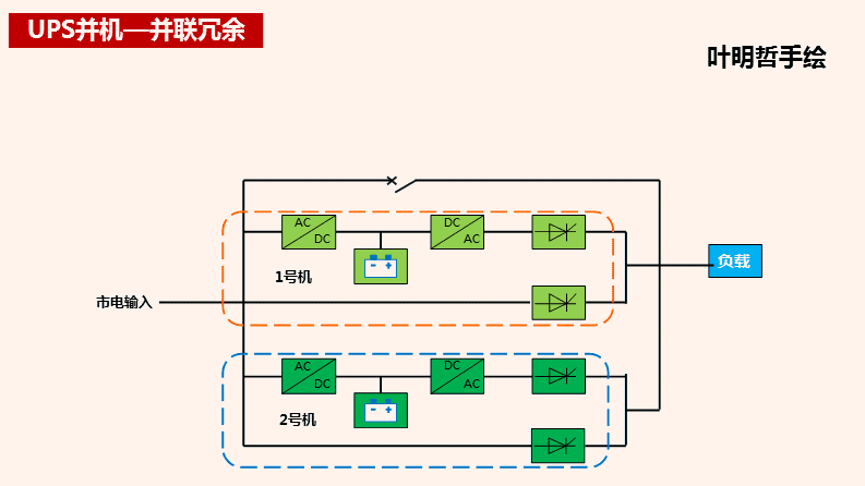 正常情況下主機(jī)帶載,從機(jī)空載,負(fù)荷不均分;主從機(jī)之間互換較困難,從機(jī)電池長期空載,設(shè)備老化不一致;從機(jī)需要有帶階躍性負(fù)載的能力,否則會出現(xiàn)主機(jī)切從機(jī),從機(jī)切旁路情況;該方法目前基本不再使用。