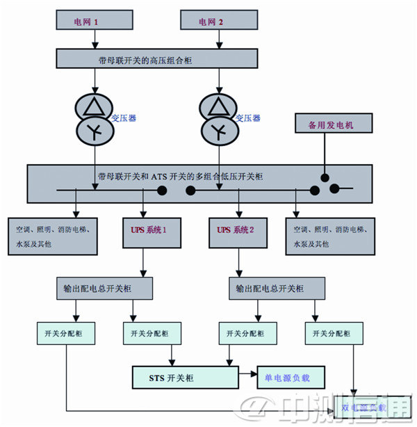 雙總線供電方式是采用兩條總線對后端設備進行供電,每條總線上具有相同的一套UPS供電方式。消除可能出現(xiàn)在UPS輸出端與最終用戶負載端之間的“單點瓶頸”故障隱患,以提高輸出電源供電系統(tǒng)的“容錯”功能。此供電方式能夠在線維護、在線擴容、在線升級,提高了重要總線的可用性,滿足了雙電源用電設備的需求,真正實現(xiàn)了7×24×365小時運行的目標。但是雙總線冗余供電方式相當于搭建了兩套前述供電方式的回路,需要增加2倍以上的成本。